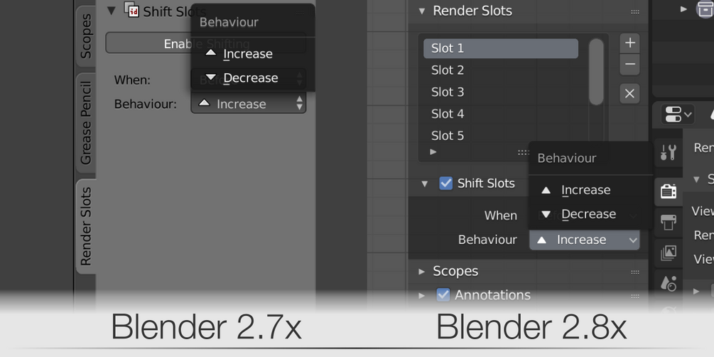 - In Blender 2.79 there are 8 built-in slots available by default. In Blender 2.8x you can add more slots, and therefore have an unlimited amount of them. When you reach the last slot, it will automatically jump to the first one.